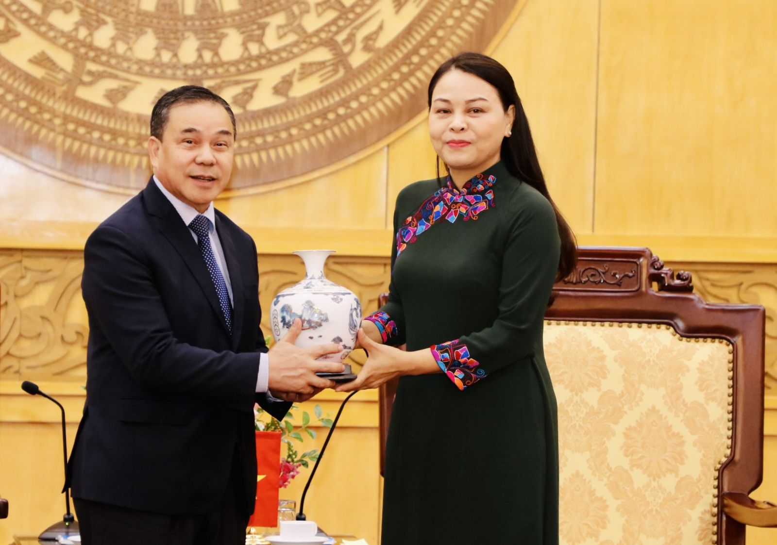 Phát biểu chào mừng, đồng chí Nguyễn Thị Thu Hà, Uỷ viên Trung ương Đảng, Bí thư Tỉnh uỷ, Trưởng Đoàn ĐBQH tỉnh bày tỏ vui mừng phấn khởi được đón đồng chí Đại sứ đặc mệnh toàn quyền nước CHDCND Lào và phu nhân cùng Đoàn công tác đến thăm, làm việc với lãnh đạo tỉnh Ninh Bình. Thay mặt Tỉnh ủy, HĐND, UBND, Ủy ban MTTQ Việt Nam tỉnh, đồng chí Bí thư Tỉnh ủy cảm ơn đồng chí Đại sứ đặc mệnh toàn quyền nước CHDCND Lào và phu nhân cùng Đoàn công tác đã dành thời gian thăm, làm việc, trao đổi, thúc đẩy mối quan hệ giữa hai Đảng, Nhà nước và Nhân dân hai nước ngày càng bền chặt.Đồng chí Bí thư Tỉnh ủy nhấn mạnh quan hệ hữu nghị Việt Nam-Lào là mối quan hệ rất đặc biệt, thủy chung, son sắt; tỉnh Ninh Bình cũng có mối quan hệ rất gắn bó với tỉnh U-Đôm-Xay. Đảng bộ, chính quyền và Nhân dân Ninh Bình luôn nhận thức sâu sắc về mối quan hệ đặc biệt giữa hai Đảng, nhà nước và Nhân dân hai nước và luôn có ý thức góp phần xây dựng, giữ gìn, làm sâu sắc hơn mối quan hệ tốt đẹp đó. Đồng chí Bí thư Tỉnh ủy cũng giới thiệu khái quát về tình hình phát triển kinh tế - xã hội và những tiềm năng, thế mạnh của tỉnh Ninh Bình; về kết quả hợp tác, hỗ trợ lẫn nhau của tỉnh Ninh Bình và tỉnh U-đôm-xay, quan hệ của Ninh Bình với tỉnh Hủa-phăn của Lào thời gian qua. Theo đó từ năm 2011, tỉnh Ninh Bình bắt đầu ký kết Chương trình hợp tác với tỉnh U-đôm-xay, hai bên cũng tích cực trao đổi các Đoàn cấp cao nhằm thông báo cho nhau tình hình của mỗi địa phương, trao đổi kinh nghiệm trong lãnh đạo, chỉ đạo và tổ chức thực hiện những nhiệm vụ chính trị, đánh giá hiệu quả hợp tác trên các lĩnh vực đã ký kết và những vấn đề hai bên cùng quan tâm. Trong tháng 6/2022, Đoàn đại biểu cấp cao tỉnh Ninh Bình do đồng chí Phạm Quang Ngọc, Phó Bí thư Tỉnh ủy, Chủ tịch UBND tỉnh dẫn đầu đã có chuyến thăm và làm việc tại tỉnh U-đôm-xay, tỉnh Luông Pha băng và Đại học Quốc gia Lào, trong đó UBND tỉnh Ninh Bình và Chính quyền tỉnh U-đôm-xay thống nhất ký kết Biên bản thoả thuận về hợp tác trên các lĩnh vực như: Giáo dục, văn hoá, thể thao, du lịch, đầu tư, thương mại, quản lý và phát triển các khu, cụm công nghiệp. Kết quả của chuyến đi đã thúc đẩy hơn nữa mối quan hệ song phương giữa Ninh Bình với U-đôm-xay và các địa phương của Lào vì sự đoàn kết, phát triển, gắn bó, thủy chung của hai Đảng, hai Nhà nước và Nhân dân hai nước. Đồng chí Bí thư Tỉnh ủy bày tỏ mong muốn Đại sứ quán Lào và cá nhân đồng chí Đại sứ đặc mệnh toàn quyền tiếp tục quan tâm, hỗ trợ để tỉnh Ninh Bình ngày càng mở rộng phát triển quan hệ hợp tác trên các mặt với các địa phương của Lào, nhất là hợp tác chia sẻ về quản trị xã hội, phát triển kinh tế-xã hội nói chung,...